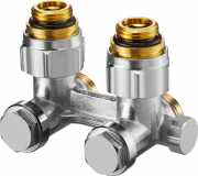 Zweirohr-Block, umstellbar auf Einrohrbetrieb, aus Messing, vernickelt, Rohrabstand 50 mm, selbstdichtend zum Heizkörper